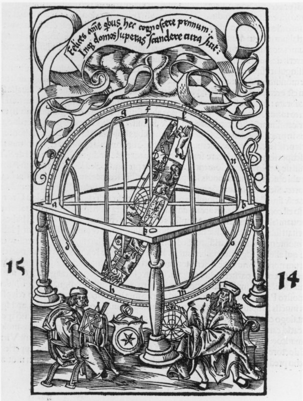1514 gab Georg Tannstetter die Finsternistabellen des Georg Aunpeck von Peuerbach im Druck heraus, gemeinsam mit der Tabelle des ersten Umschwunges, d. h. des Fixsternhimmels, von Johannes Regiomontanus. Darin findet sich diese Darstellug zweier Astronomen: links ein mitschreibender Schüler, rechts der erläuternde Lehrer. Als dargestellte Personen kommen Tannstetter selbst (Wappen mit dem sechszackigen Stern), Regiomontanus oder Ptolemaios in Frage.