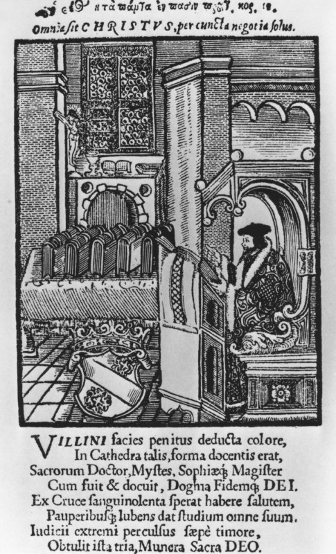 Der Leibnitzer Gelehrte hielt die während der Reformationszeit herabgekommene Theologische Fakultät am Leben. Die Darstellung gibt einen seltenen Einblick in einen Wiener Hörsaal mit Lehrkanzel und einem Bibliothekstisch im Hintergrund, an dem mehrere Bücher angekettet dargestellt sind („libri catenati“).