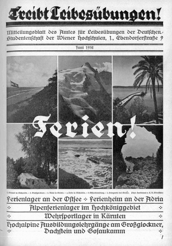 „Ferien!“, Titelblatt „Treibt Leibesübungen! Mitteilungsblatt des Amtes für Leibesübungen der Deutschen Studentenschaft der Wiener Hochschulen“, Juni 1932