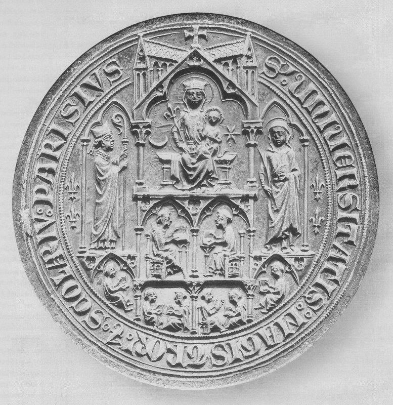 Das aus dem 13. Jahrhundert stammende Siegelbild zeigt unter dem gotischen Baldachin die Himmelskönigin als Schirmherrin der Wissenschaft; rechts und links von ihr zwei Heilige, darunter zwei Magisitri und sechs Studenten.