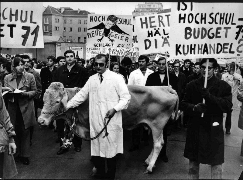Demonstranten mit einer Kuh und Tafel mit dem Slogan: "Ist Hochschulpolitik Kuhhandel?" und Tafel "Hochschulpleitegeier schlägt zu + Karikatur von Bruno Kreisky"