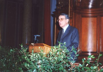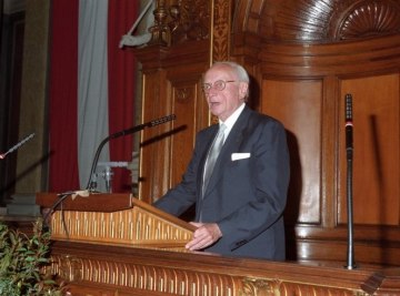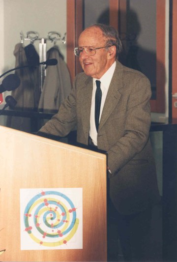 Der aus Österreich stammende Nobelpreisträger Max F. Perutz, nach dem die Max Perutz Labs Vienna benannt wurden, bei einem Besuch am Campus Vienna Biocenter (VBC) 1995.