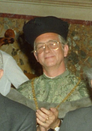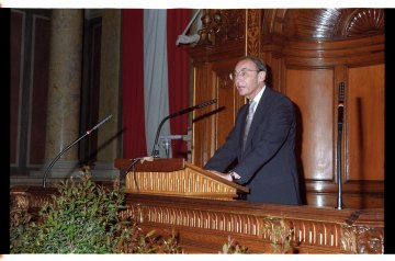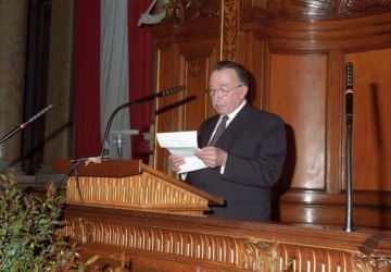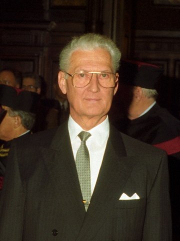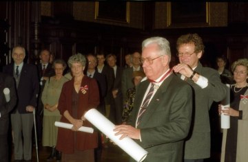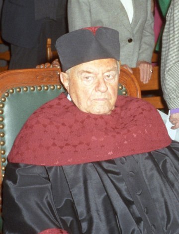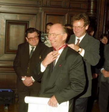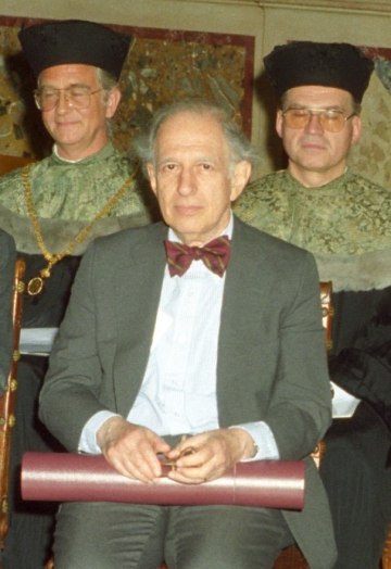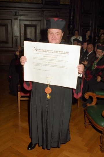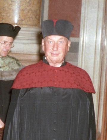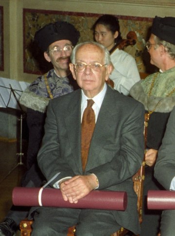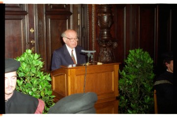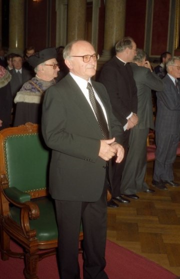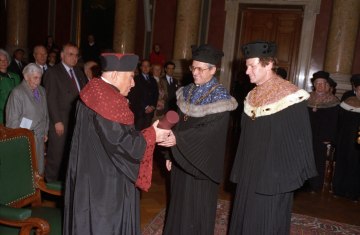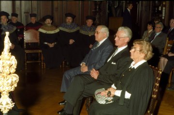 Marcel Prawy bei der Verleihung des Ehrendoktorats der Universität Wien durch Dekan Franz Römer und Rektor Ebenbauer