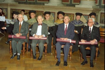 Kurt Blaukopf, Eric Kandel, Paul Åström und Herbert Grossmann bei bei der Verleihung der Ehrendoktorate bzw. der Ehrenbürgerschaft der Universität Wien