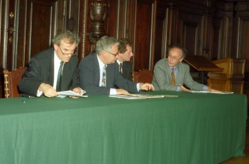 Eröffnung des ersten Wissenschaftskollegs 1994 als Vorläufer der späteren Doktoratskollegs, von rechts nach links: FWF-Präsident Arnold Schmidt, Wissenschaftsminister Erhard Busek, Rektor Alfred Ebenbauer, Univ.-Prof. Helmut Ruis