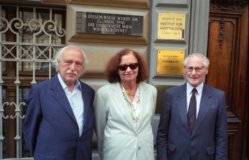 Kurt Schubert (1923–2007), Erika Weinzierl (1925–2014) und Hans Tuppy (1924–2024) bei der Gedenktafelenthüllung Frankgasse 1