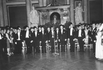 Rektor Nikolaus Hofreiter (Mitte) und andere Festgäste bei der Eröffnung des 1. Universitätsball im Großen Festsaal der Universität Wien