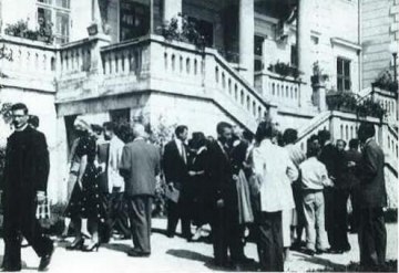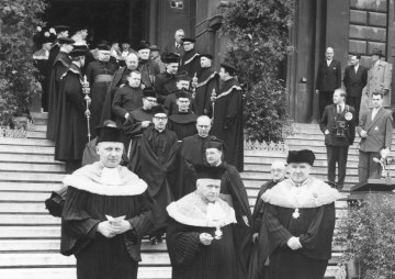 Trauerfeier für den im Amt verstorbenen Rektor Wilhelm Czermak: Universitäre Würdenträger auf den Stiegen der Universität