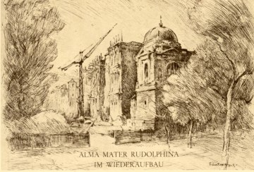 Postkarte als 2-Schilling-Bausteinspende für den Wiederaufbau der Univ. Wien, hrsg. vom Spendenkomitee unter dem Ehrenschutz der Universität Wien