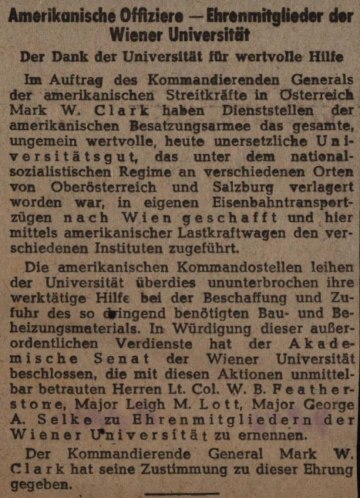 Zeitungsartikel „Amerikanische Offiziere – Ehrenmitglieder der Wiener Universität“, in: Neues Österreich, 9.2.1946