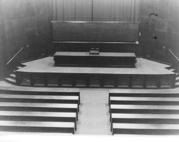 Das Auditorium Maximum im Hauptgebäude der Universität Wien, mit Blick auf das Podium, vor Anbringung von Doppeladler und Kruzifix 1936