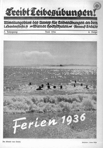 „Ferien 1936“, Titelblatt „Treibt Leibesübungen! Mitteilungsblatt des Amtes für Leibesübungen an den Wiener Hochschulen“, Juni 1936