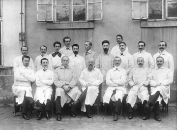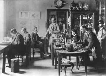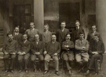 Mitglieder des II. Chemischen Laboratoriums zwischen 1910 und 1915, aufgenommen in der Loggia des 1. Chemischen Instituts („Alte Chemie“), Währinger Straße 10