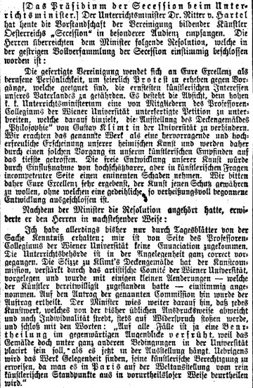 „Das Präsidium der Secession beim Unterrichtsminister“, Zeitungsartikel in „Neue Freie Presse“ vom 28. März 1900