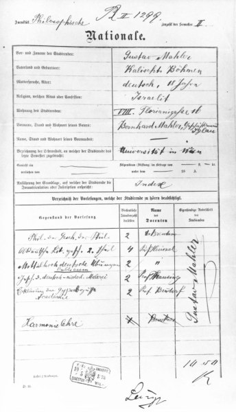 Gustav Mahlers eigenhändig geschriebenes Inskriptionsblatt der Universität Wien, Sommersemester 1878, für Anton Bruckners Vorlesung