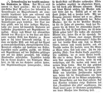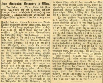 „Demonstration der deutsch-nazionalen Studenten in Wien“, Zeitungsartikel in Leitmeritzer Zeitung vom 18. April 1883