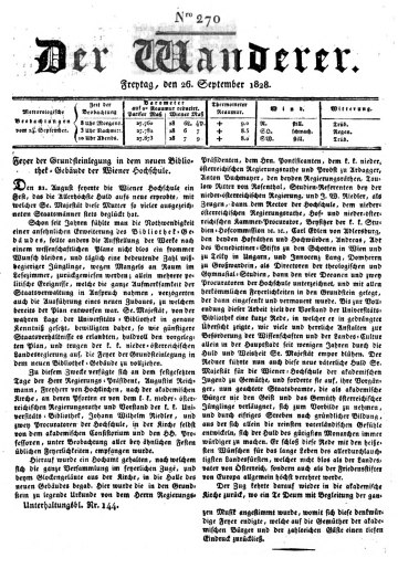 „Feyer der Grundsteinlegung in dem neuen Bibliothek-Gebäude der Wiener Hochschule“, Zeitungsartikel in „Der Wanderer“ vom 26. September 1828