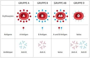 Die von Landsteiner entdeckten Blutgruppen, ihre Antigene auf der Oberfläche der roten Blutkörperchen und ihre Antikörper im Blutplasma.