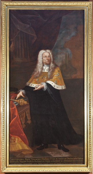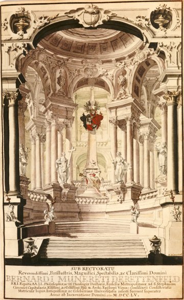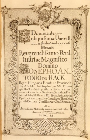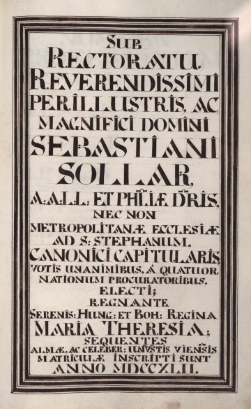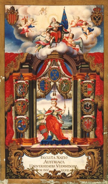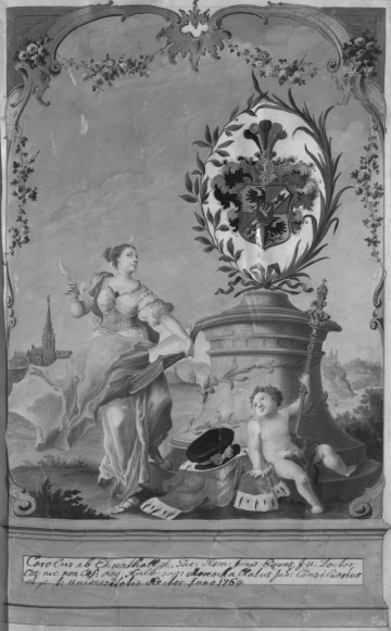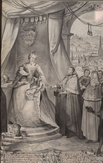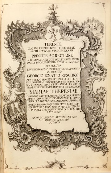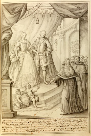Rektor Johannes Joseph Fraisl und die vier Dekane überbringen Maria Anna von Habsburg und Karl Alexander von Lothringen ihre Glückwünsche zur Hochzeit, 31. Jänner 1744