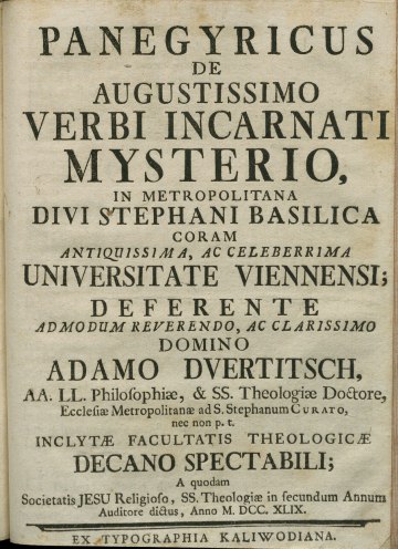 Titelblatt des 'Panegyricus De Augustissimo Verbi Incarnati Mysterio in Metropolitana Divi Stephani Basilica Coram Antiquissima, Ac Celeberrima Universitate Viennensi'