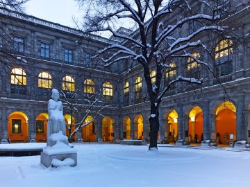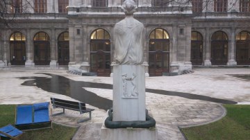 „Der Muse reichtʼs“, Kunstprojekt von Iris Andraschek im Arkadenhof der Universität Wien, ausgehend vom Kastaliadenkmal