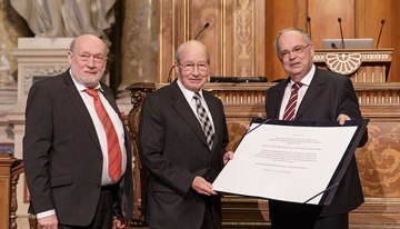 Verleihung des goldenen Ehrenzeichens an Wilhelm Fleischhacker, durch Dekan Horst Seidler und Rektor Heinz Engl
