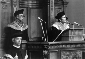 Promotion von Gabriele Possanner, 2. April 1897. Die Nostrifikation ihres Schweizer Doktorats war die erste Promotion einer Frau an der Universität Wien.