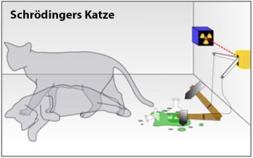 In der Quantenmechanik gibt es überlagerte Zustände, die ein Gedankenexperiment ermöglichen, in dem eine Katze sowohl tot als auch lebendig ist. Erst die Beobachtung (Messung) würde den Zustand der Katze eindeutig entscheiden.