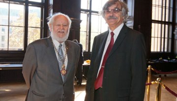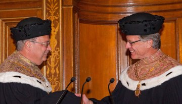 Inauguration des Rektors Heinz Engl: Der neue Rektor Heinz Engl (mit Rektorskette) und der scheidende Rektor Georg Winckler (mit Rektorserinnerungszeichen)
