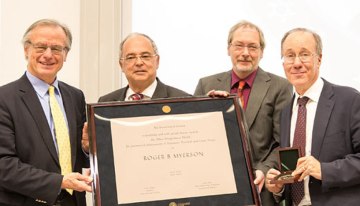 Verleihung der Oskar-Morgenstern-Medaille an Roger Myerson durch Altrektor Georg Winckler, Rektor Heinz W. Engl und Dekan Oliver Fabel