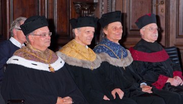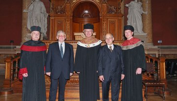 Géza Alföldy und Alfons Bürge bei der Verleihung der Ehrendoktorate durch die Laudatoren Ekkehard Weber und Franz Stefan Meissel sowie Rektor Georg Winckler