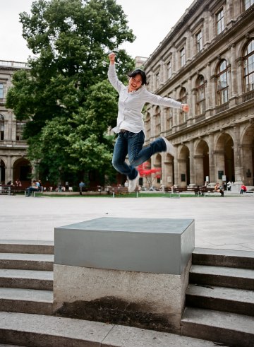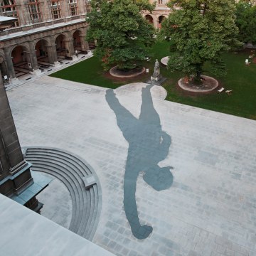 Studentin Hyunjin Lee als „lebendes Denkmal“, Fotoserie im Zuge des Kunstprojekts „Der Muse reichtʼs“ von Iris Andraschek im Arkadenhof der Universität Wien