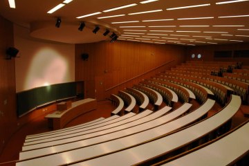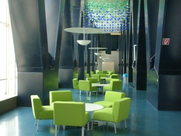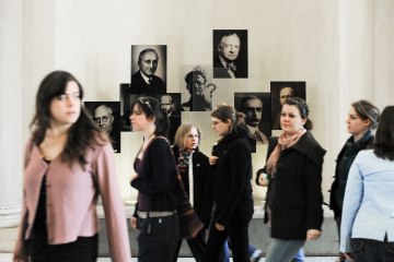 Studierende vor der Installation „Nobelpreis und Universität Wien – Gruppenbild mit Fragezeichen“ (2006) in der Aula der Universität Wien
