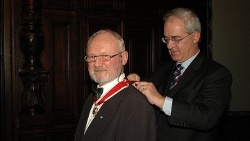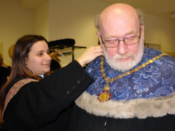 Hinter den Kulissen: Szepterträgerin Birgit Mnozil von der DLE Personalwesen und Frauenförderung legt Dekan Horst Seidler von der Fakultät für Lebenswissenschaften kurz vor der akdademischen Abschlussfeier die Dekanskette um.