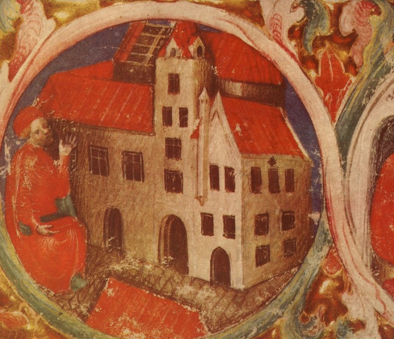 Bildmedaillon aus dem "Rationale divinorum officiorum" des Wilhelm Duranti. Es zeigt Herzog Albrecht III., der 1384 zwei Häuser ankaufte und zur Errichtung des Herzogskollegs schenkte.